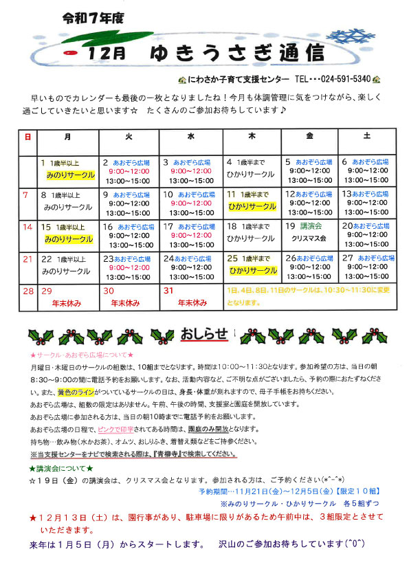 子育て支援 ホーム > 子育て支援 > 子育て支援のお知らせ 子育て支援のお知らせ 支援センターの日程等の確認ができます。 ゆきうさぎ通信令和7年度12月号 ゆきうさぎ通信令和7年度11月号 ゆきうさぎ通信令和7年度10月号